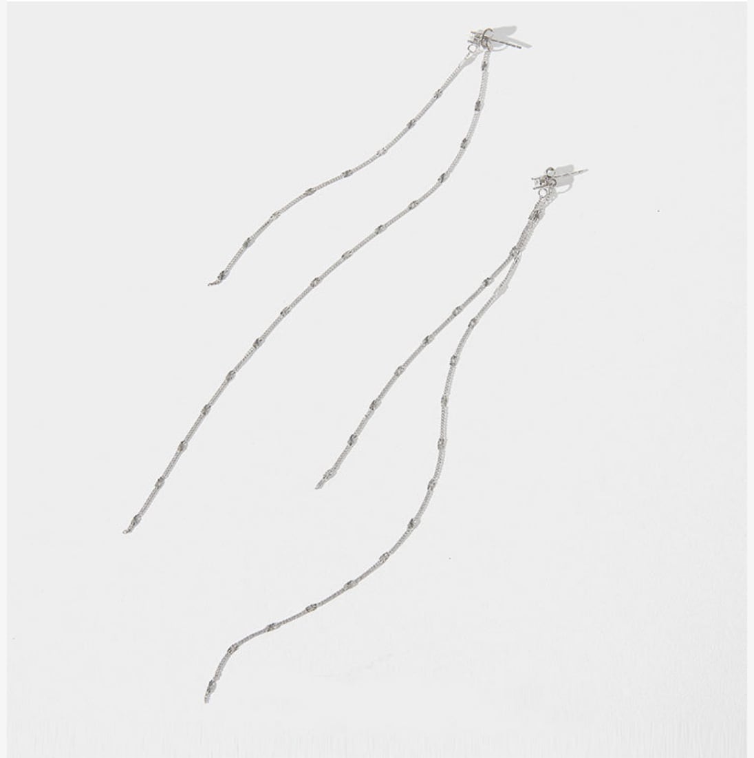 流れるような美しいロングチェーンデザインが特徴のシルバーピアスです。シンプルながらも、耳元で輝きを放ち、カジュアルからフォーマルまで幅広いシーンにぴったり。コーディネートに合わせて、存在感を引き立てるアイテムです。